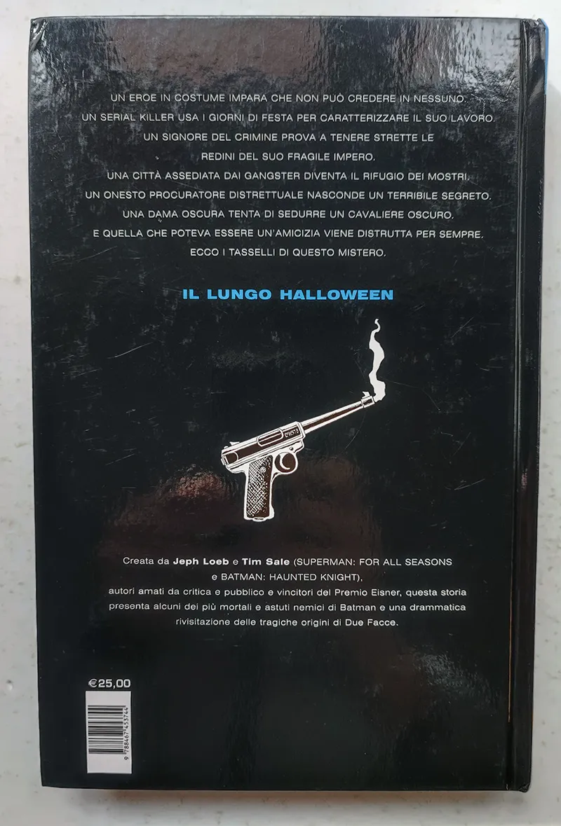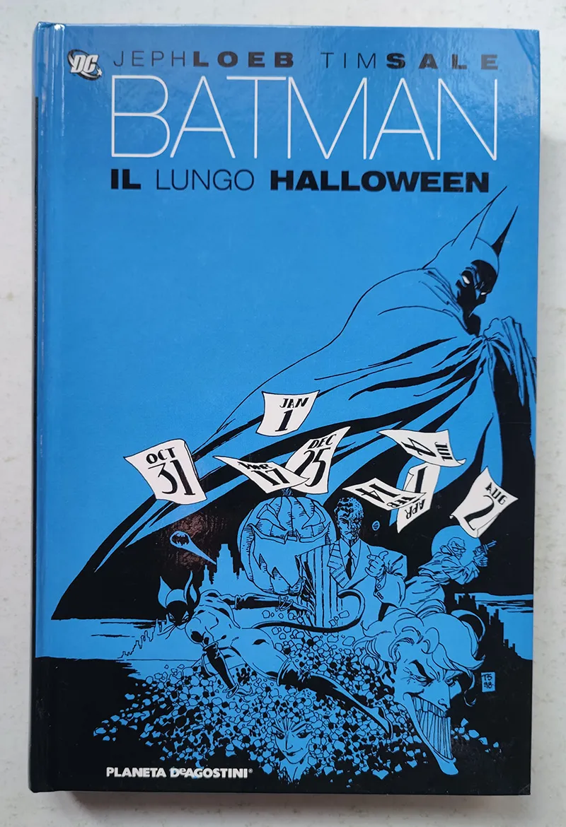 Note [Notes]: Volume cartonato della Planeta DeAgostini “Il Lungo Halloween” presenta una storia in 13 capitoli che abbracciano un anno completo, nel quale la città di Gotham è afflitta da un assassino chiamato Holiday. Il Cavaliere Oscuro, con l’aiuto del poliziotto James Gordon e del procuratore distrettuale Harvey Dent, affronta una sfida contro il tempo per riportare la pace in città prima della fine dell’anno. Il mistero sull’identità di Holiday e la riscrittura delle origini di uno dei migliori nemici del personaggio terranno il lettore incollato per tutto il volume. Scritto da Jeph Loeb e disegnato da Tim Sale. La confezione cartonata e il formato omnibus contenente tutte le copertine degli albi originali americani (nonchè una esauriente prefazione) ne fanno un’edizione di prestigio.