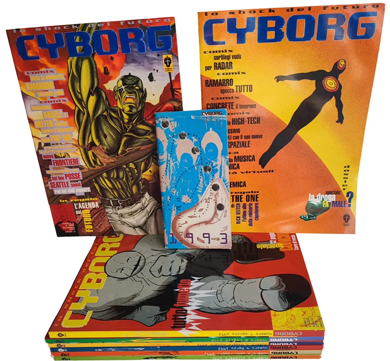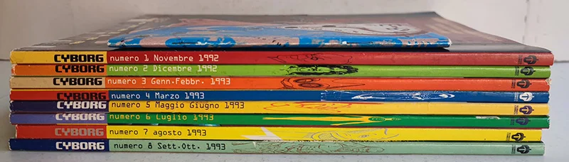 Note [Notes]: Cyborg (2ª serie) si tratta della prosecuzione della rivista precedentemente uscita per Star Comics, ripesa dall’editore Telemaco. E’ una rivista pubblicata per otto numeri, usciti in edicola e fumetteria tra il novembre 1992 e il settembre/ottobre 1993. Storie di Massimo Semerano (“Fondazione Babele”), Daniele Brolli (“Ramarro”), Piero dell’Agnol (“So long Baby”), Francesca Ghermandi (“Helter Skelter”), J. Olivieri (“Igor Iguana”), M. Albano (“Primo in classifica”, “Radar”), Giorgio Lavagna (“Primo in classifica”, “Radar”), Gabos (“Rodax call boy”), Massimo Mattioli (“Bam-Boom”). Disegni di Giuseppe Palumbo (“Ramarro”), Piero dell’Agnol (“So long Baby”), Francesca Ghermandi (“Helter Skelter”), J. Olivieri (“Igor Iguana”), Giovanni Liani (“Primo in classifica”), Davide Toffolo (“Rodax call boy”), Stefano Natali (“Radar”), Massimo Mattioli (“Bam-Boom”). Copertine di Giuseppe Palumbo (nn.1/3, 6), Giovanni Liani (n. 2), Stefano Natali (n. 4), Marco Nizzoli (n. 5), Paul Chadwick (n. 7), Rick Veitch (n. 8).