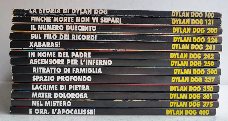 Note [Notes]: Oltre ai numeri “centanari” 100, 300 300 400, come da tradizione in casa Bonelli, la serie regolare di Dylan Dog presenta altri numeri a colori: 121 (decimo compleanno), 224, 241/242 (ventesimo compleanno, storia doppia), 250, 337 (che inaugura il nuovo corso), 350, 361 (trentesimo compleanno) e 375 (che chiude i festeggiamenti per il trentennale) di seguito titoli ed autori