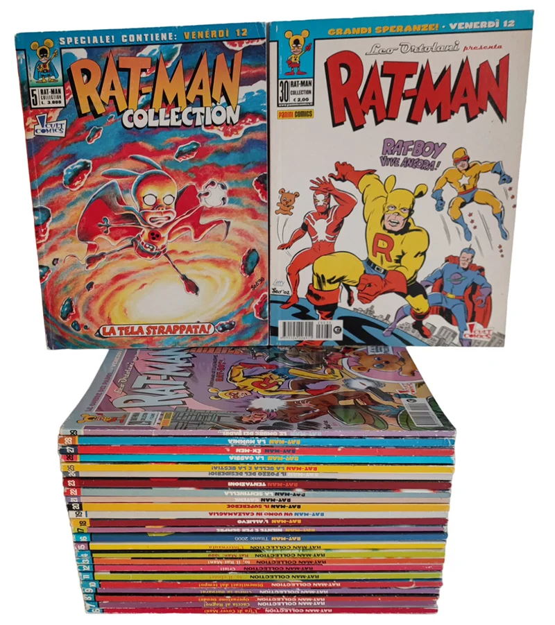 Note [Notes]: Serie pubblicata dalla Panini Comics dedicata a Rat-Man, dalla periodicità trimestrale e poi, dal n° 5, bimestrale. Fino al n° 7, oltre a una storia inedita con protagonista RAT-MAN, scritto e disegnato da Leo Ortolani, ristampa gli episodi usciti nella serie autoprodotta RAT-MAN. Oltre alle storie del personaggio principale, ogni uscita ospita ristampe o episodi inediti di altre serie di Ortolani come VENERDÌ 12 (riproposta sui nn. 5/13), articoli, servizi e anticipazioni sul mondo di RAT-MAN e il suo autore. Dal n° 16 dalla testata scompare la parola “collection” e le copertine sono colorate al computer da Lorenzo Ortolani, il fratello dell’autore. Sempre in questo numero la rivista assume un’impostazione fissa, presentando in ogni numero una storia inedita di RAT-MAN, un episodio inedito di VENERDÌ 12 e una raccolte di strisce L’ULTIMA BURBA.