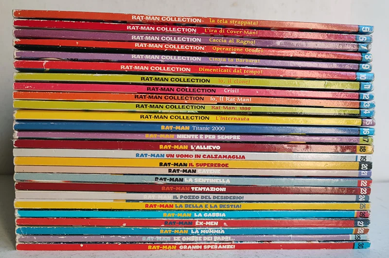 Rat-Man Collection | 5 La tela strappata!, 6 L’ira di Cover-Man!, 7 Caccia al Ragno!, 8 Operazione Geode!, 9 Cinzia la barbara!, 10 Dimenticati dal tempo!, 11 Io, il clone!, 12 Crisi! poster, 13 Io, il Rat-Man! poster, 14 Rat-Man: 1999 poster, 15 L’Internauta poster, 16 Titanic 2000, 17 Niente è per sempre, 18 L’allievo, 19 Un uomo in calzamaglia, 20 Il supereroe, 21 Catene, 22 La sentinella, 23 Tentazioni, 24 Il pozzo del desiderio!, 25 La Bella e la Bestia!, 26 La gabbia, 27 Ex-Men, 28 La mummia, 29 Le ombre dei padri…, 30 Grandi speranze! |